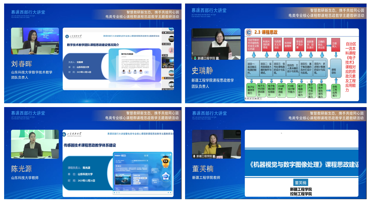 在慕课教学西部行工作组指导下,12月26日,山东科技大学与新疆工程学院再次牵手,共同开启“智慧教研新生态,携手共绘同心圆”东西部高校电类专业核心课程群课程思政教学主题教研活动。本次活动由山东科技大学数字技术教学团队和新疆工程学院课程思政教学团队联合开展。